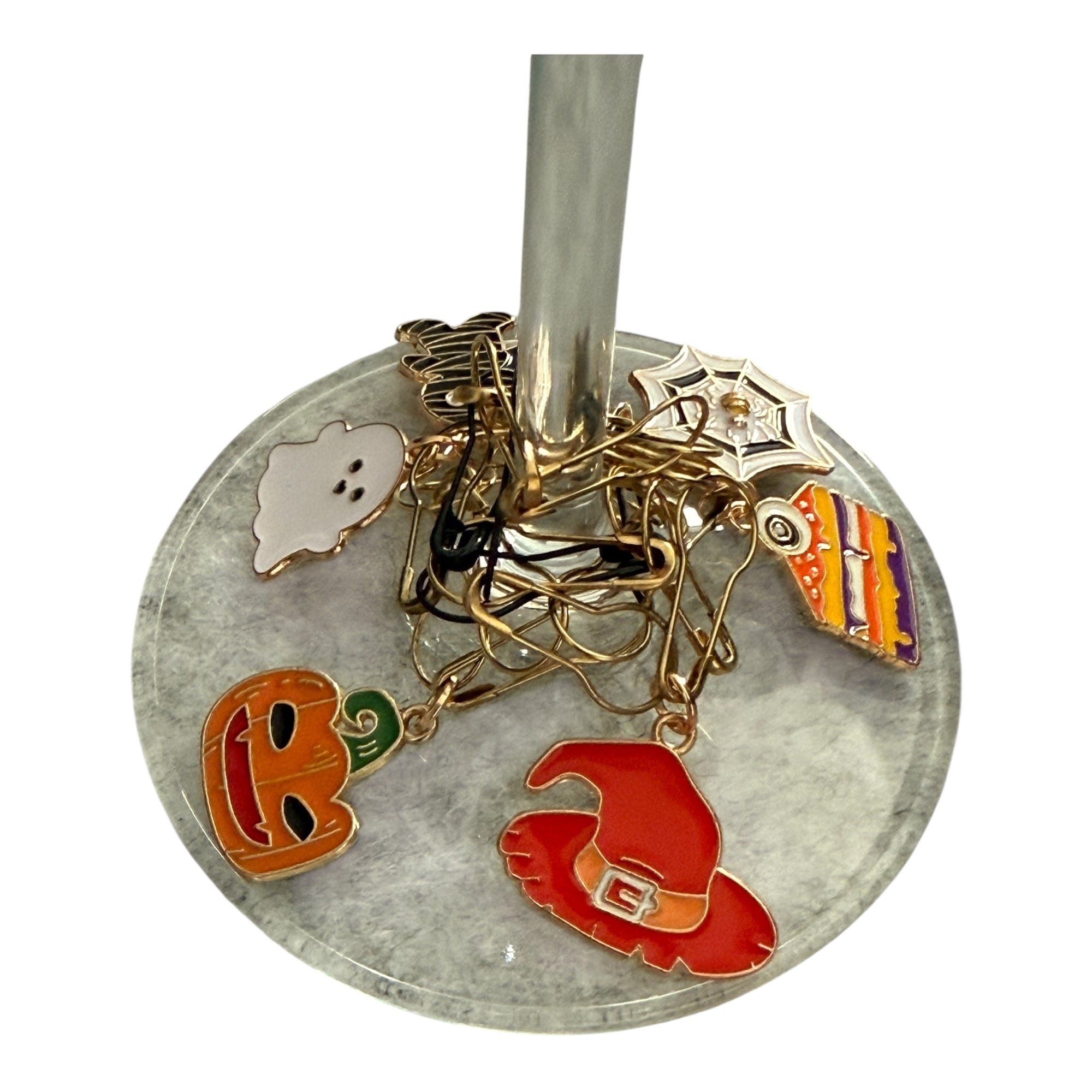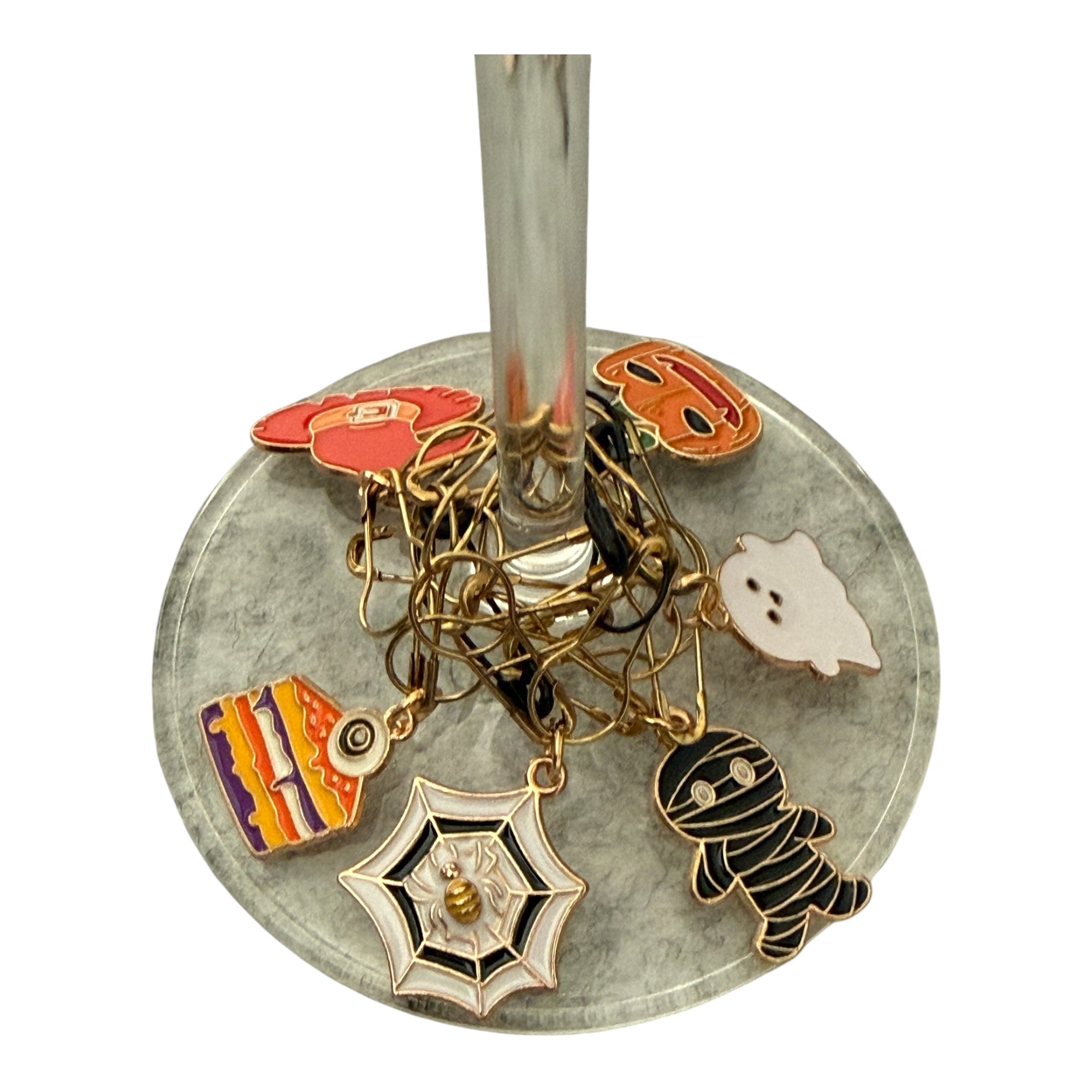 Originales marca copas confeccionados a mano con charms de motivos de Halloween e imperdibles bombilla de Folch.