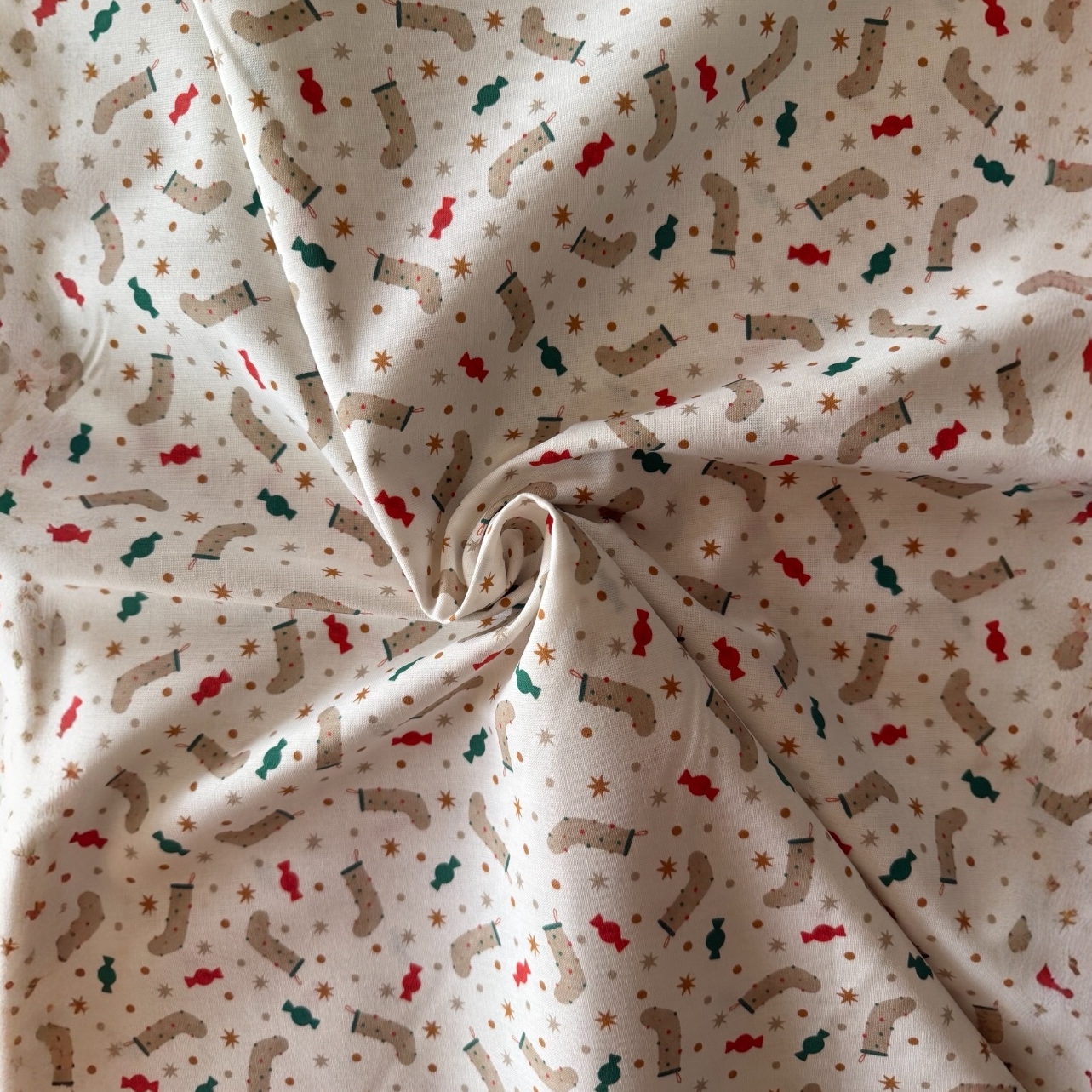 Tela popelín 100 % algodón con dibujos de calcetines navideños y caramelos.